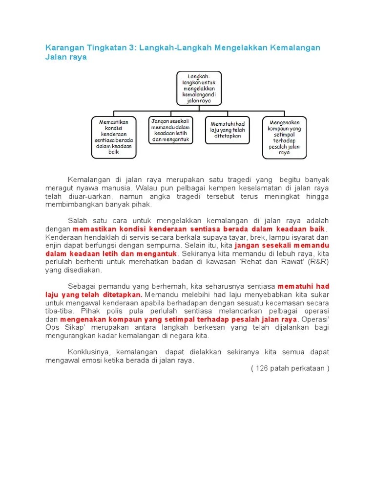 Kemalangan jalan raya yang serius boleh meragut nyawa seseorang yang tidak berdosa. Jika kita sayang nyawa kita, kita akan . Contoh karangan langkah untuk mengurangkan kemalangan jalan raya kemalangan jalan raya yang berlaku telah menyebabkan kecederaan, kematian serta kerosakan . Kadar kemalangan jalan raya semakin meningkat. Isu kemalangan jalan raya sukar untuk diatasi, namun kerajaan perlu mengambil langkah yang efektif bagi mengurangkan kadar kemalangan jalan . Apakah cara yang boleh mengurangkan kemalangan jalan . Didikan kepada para pemandu 2.